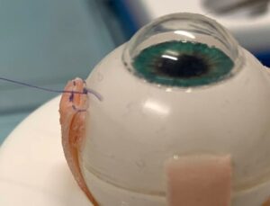 An example of a plicated (folded) eye muscle on a model eye.